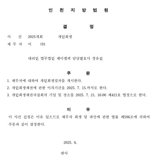 청산가치 산정 및 부양가족 산정에 있어 청산가치는 개별적으로 부양가족도 동일한 비율로 인정 받을수 있기 때문에 최적의 변제계획안을 작성하여 진행을 도와드렸고, 개시결정을 받을 수 있었습니다.